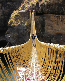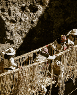 El puente Q’eswachaka está ubicado sobre el río Apurimac a unos 11,811 pies sobre el nivel del mar en la provincia de Canas a unos 160 km al sur de Cusco. Conocido como Q’eswachaka (la primera sílaba es un»clic» lateral), Queshuachaca o Keshwa Chaca, este es uno de los pocos ejemplos que quedan de los puentes tejidos a mano incas que alguna vez fueron comunes en el sistema vial incaico.