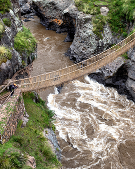 El puente Q’eswachaka está ubicado sobre el río Apurimac a unos 11,811 pies sobre el nivel del mar en la provincia de Canas a unos 160 km al sur de Cusco. Conocido como Q’eswachaka (la primera sílaba es un»clic» lateral), Queshuachaca o Keshwa Chaca, este es uno de los pocos ejemplos que quedan de los puentes tejidos a mano incas que alguna vez fueron comunes en el sistema vial incaico.